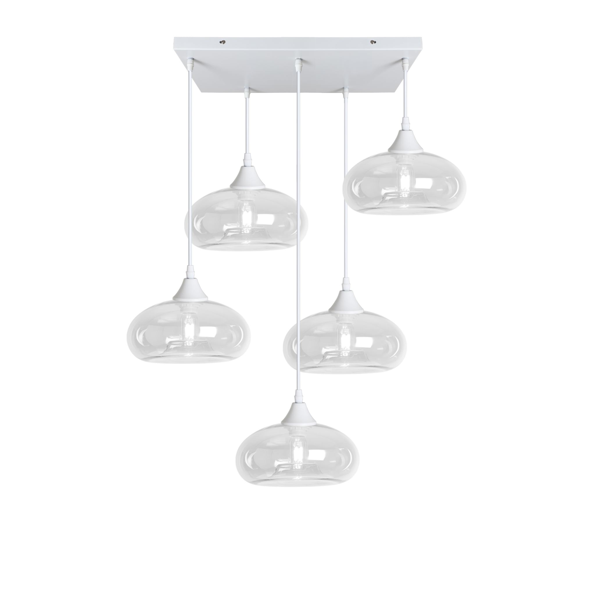 5 light ceiling pendant with white braided cable complete with white ceiling plate and lamp holder with your choice of glass shade